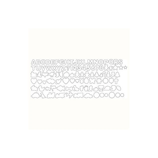 tout l’alphabet / les chiffres de 1 à 8 / 3 coeurs de tailles différentes / 3 coeurs à bordures festonnées de tailles différentes / 1 double coeur / 1 coeur transpercé d’une flèche / 1 tête de lapin / 1 oeuf / 2 citrouilles de tailles différentes / 1 fantôme / 1 lune / 1 chat angoissant / 1 maison hantée / 1 sorcière / 1 chauve-souris / 1 garçon / 1 fille / 2 sapins de Noël de tailles différentes / 1 bonbon / 1 bonhomme de neige / 1 entrepôt / 1 clochette / 1 pied / 1 main / 1 botte / 1 chapeau de cow-boy / 1 étoile filante / 1 drapeau / 3 cercles de tailles différentes / 3 étoiles de tailles différentes / 3 cercles à bordure festonnée de tailles différentes / 1 os / 1 chien / 1 poisson / 2 ours de tailles différentes / 1 canard / 1 stegasaurus / 1 T-Rex / 1 coupe de champion / 1 casquette de base-ball / 1 casque de football américain / 1 balle de football /1 train / 1 voiture / 1 avion / 1 camion de pompier / 1 camion benne