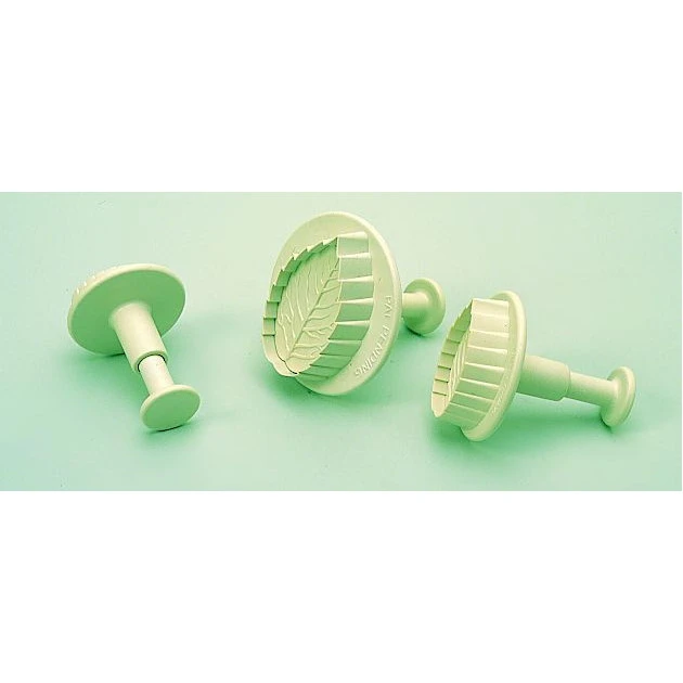 Jeu de 3 Emporte pièces à Poussoir. Le poussoir permet l’extraction facile de la pâte découpée. Ces découpoirs permettent également de marquer sur la pâte les nervures des feuilles.