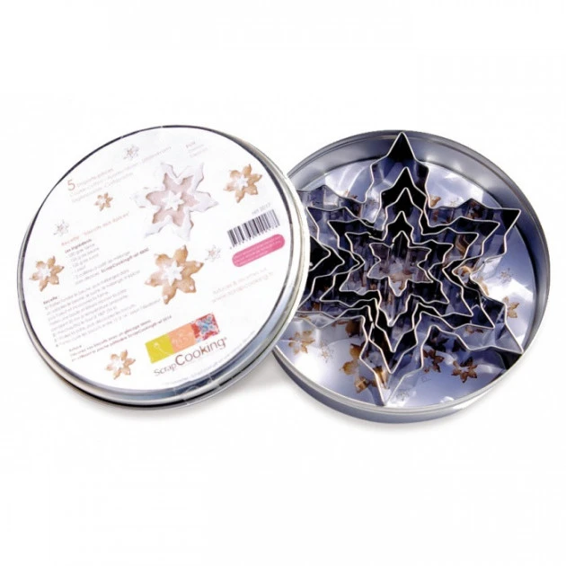 Cette boite de 5 découpoirs « Flocons » vous permettra de réaliser des biscuits, des cookies, du pain d’épices et de la pâte à sel en forme de flocons et de 5 tailles différentes.