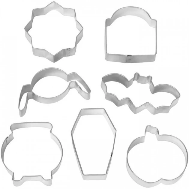 Ce kit de découpoirs Halloween se décline sous 7 formes : Chauve-souris, araignée, toile d’araignée, citrouille, chaudron, cercueil et pierre tombale. La panoplie complète pour des biscuits d’Halloween aussi effrayants que gourmands pour décorer votre table.