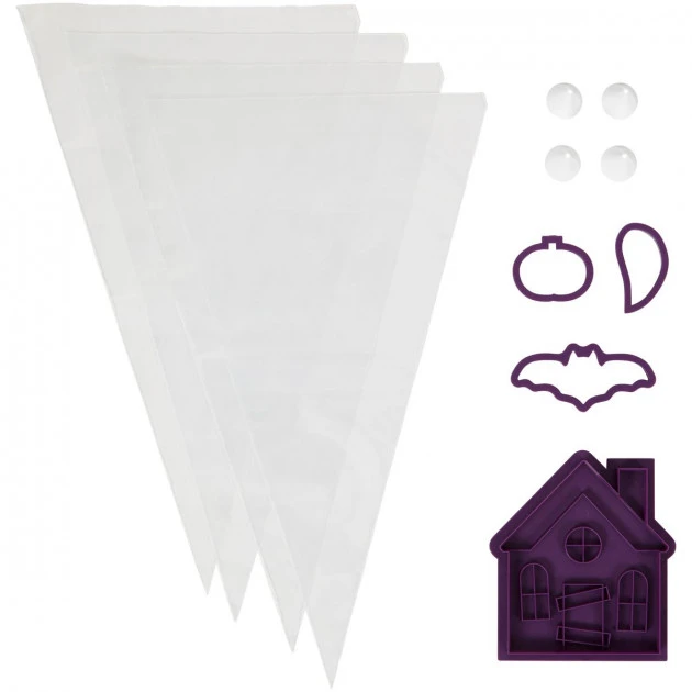 - Détails des pièces: 1 grand emporte-pièce tampon maison hantée + 3 petits emporte-pièces (citrouille + chauve-souris + fantôme) + 4 poches à douilles jetables + 4 douilles pâtissières