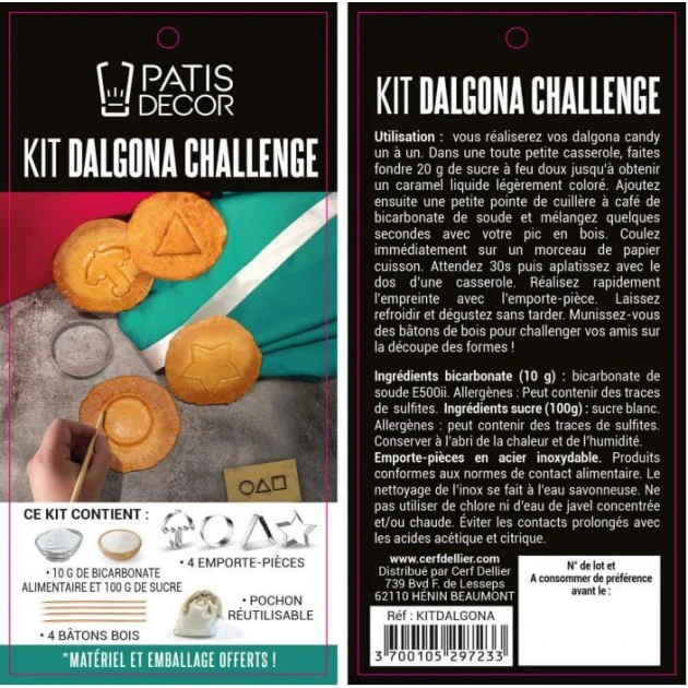 Vous pouvez désormais tenter de relever le défi chez vous grâce à ce kit emporte-pièces dalgona challenge. Emballé dans un pochon en toile de lin, ce kit complet dispose de tous les ingrédients nécessaires à la préparation de vos biscuits. Vous trouverez donc 100 g de sucre semoule, 10 g de bicarbonate de soude, ainsi que 4 batônnets pour mélanger et 4 emporte-pièces en inox.