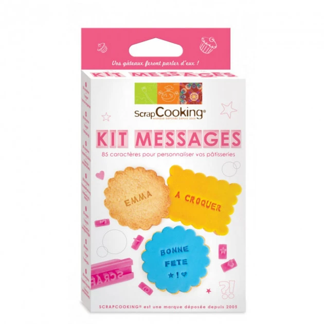 A l’aide du Kit Messages Scrapcooking réalisez très facilement des biscuits personnalisés : prénoms, voeux, messages de bonheur, dictons … Les 85 emporte-pièces lettres, chiffres et symboles vous permettront de faire apparaître les messages de votre choix sur vos biscuits, décors en pâte à sucre ou pâte d’amande.